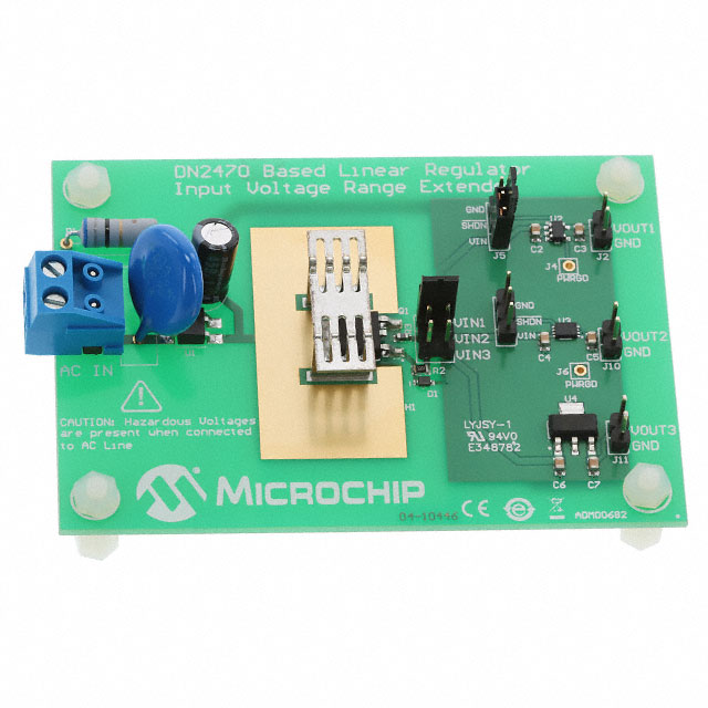 | Stato senza piombo / Stato RoHS | Lead free / RoHS Compliant | Descrizione dettagliata | DN2470, MCP1754, MCP1755, MCP1790 1 - Single Channels per IC Positive Fixed Linear Voltage Regulator Evaluation Board |